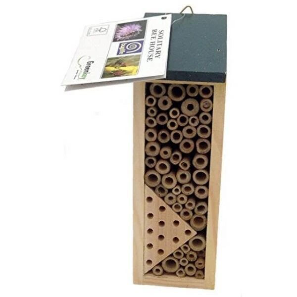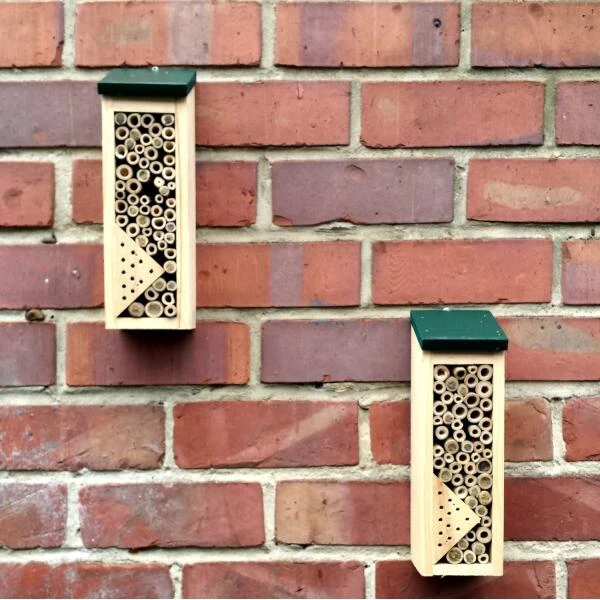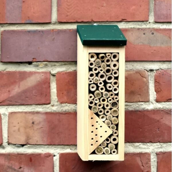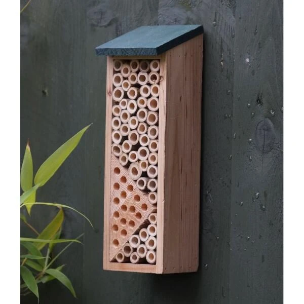 Deze bijenchalet is speciaal ontworpen om een veilige nestelplek te bieden aan solitaire bijen. De bamboebuisjes hebben de ideale afmetingen voor deze nuttige insecten en de driehoek van hout geeft insecten een veilige plek.