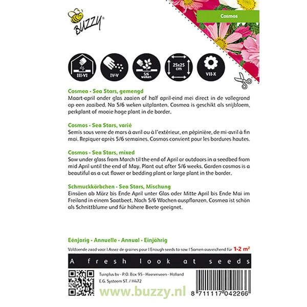 Cosmea of Cosmos Sea Stars is een prachtige snijbloem en perkplant die met veel andere vaste planten gecombineerd kan worden. De éénjarige plant wordt ongeveer 80 cm hoog. De bloemen bloeien rijkelijk en lang en zijn bovendien uitstekende nectarbronnen voor insecten. Sea Stars gemengd is een mix van witte en roze bloemen in diverse tinten.