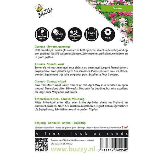 Cosmos Sonate, een éénjarige rijke bloeier die ook wel Cosmea wordt genaamd. Het zijn rijk en lang bloeiende éénjarige planten en opvallend goede, lang houdbare snijbloemen. De kokervormige bloemen zijn heel bijzonder. Cosmea houdt van zon.