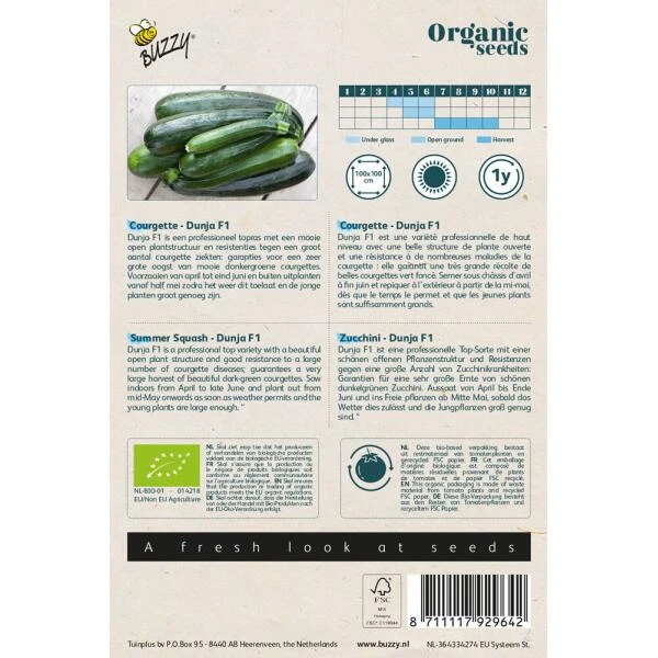 Courgette Dunja F1 is een professioneel hybride topras. De planten hebben een mooie open structuur en zijn resistent tegen een groot aantal courgetteplagen. Dit ras geeft garanties op een zeer grote oogst. De courgettes zijn mooi donkergroen. Voorzaaien kan van april tot eind juni en vanaf half mei zodra het weer het toelaat en de plantjes groot genoeg zijn uitplanten in de volle grond.