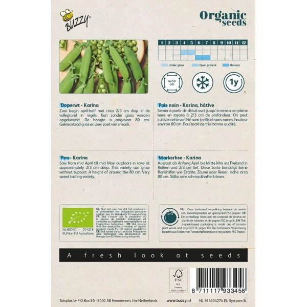 Kweek zelf erwten op een biologische manier en start met biologische zaden. Deze doperwten worden in het bijzonder geteeld voor de bolletjes die zich in de schelp bevinden. Het ras ‘Karina’ is extra zoet van smaak en groei in struikvorm (40 cm hoog).