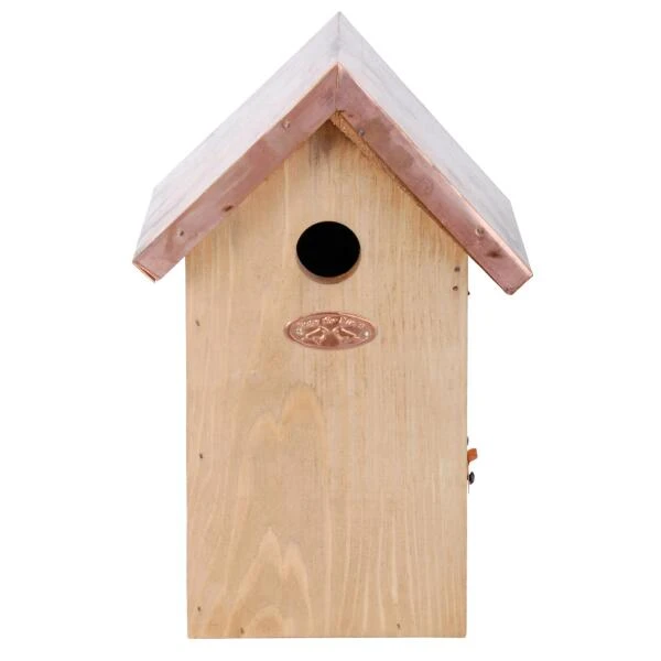 De nestkast is bruin geïmpregneerd en is afgewerkt met een koperen dak. De zijkant van de nestkast draait gemakkelijk openen om ze tijdig te reinigen in het voorjaar.