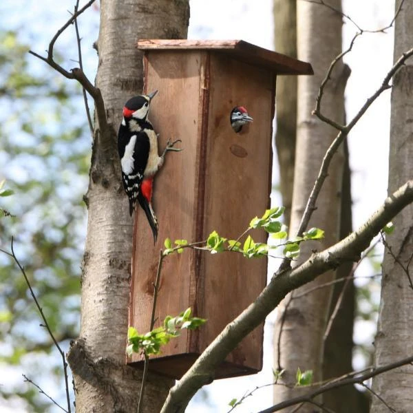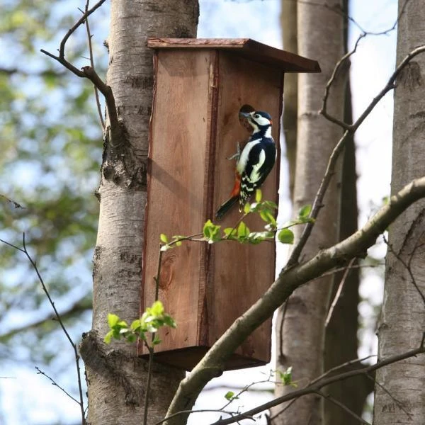 De op een holle boom lijkende kast hangt best op een rustige, beschutte plaats, zo’n 2 à 3 meter boven de grond. Het heeft een openklappend deurtje om de kast in het najaar te reinigen.