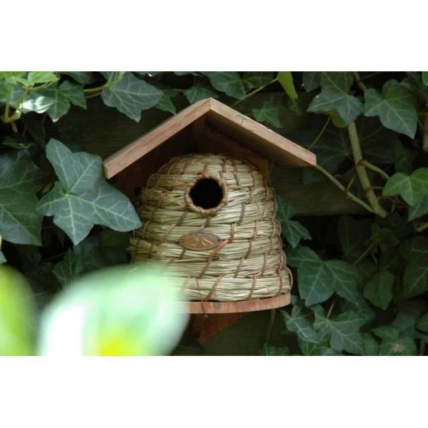 Deze originele nestkast in de vorm van een bijenkorf is vervaardigd uit riet. De korf staat op een houten houder en wordt beschermd door een houten dakje. Dit mooie vogelhuisje is geschikt voor kleine tuinvogels zoals pimpelmees, glanskop, kuifmees, matkop en zwarte mees. Hang de kast op een rustige en beschutte plaats, dus niet pal in de zon of op de regenzijde, met een vrije aanvliegroute voor de vogel.