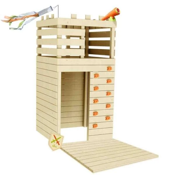 Speelhuis Knight is een modern en innovatief speelhuis voor in de tuin in hout waarop 6 kinderen zich tezelfdertijd kunnen uitleven. Het speelhuis bestaat uit 3 speelterreinen waarin kinderen zich gemakkelijk en veilig kunnen verplaatsen en spelen: het terras aan de voorzijde, de hut en het terras met uitkijkpost in de hoogte.