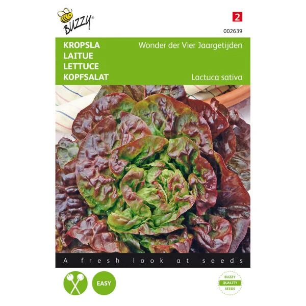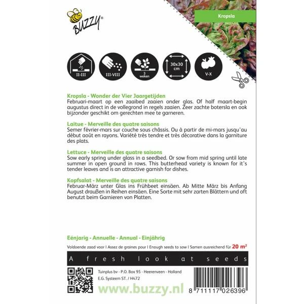 Kropsla Wonder der vier jaargetijden is een heerlijke, malse zomersla of botersla met een mooie rode kleur. Beste zaaitijd is van april tot juli, direct in de vollegrond. Het ras is geschikt voor de zomerteelt in de vollegrond. Zaai op vochtige grond op regels (of rijen) met een onderlinge afstand van 30 cm of op een zaaibed.