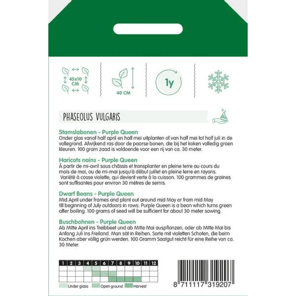 Vanaf half april onder glas en half mei uitplanten of van half mei tot begin juli in de volle grond. Afwijkend ras door paarse bonen, die bij het koken volledig groen kleuren.