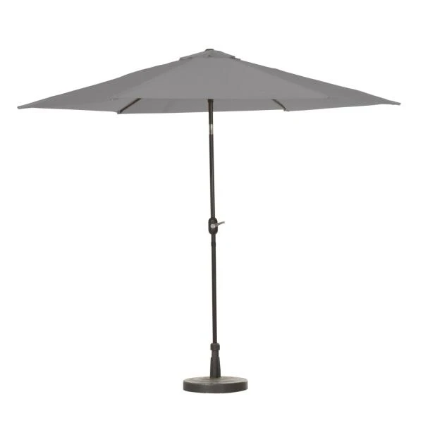 Dit staand model wordt geleverd zonder een voet en heeft een antraciet kleurig frame. Uitgeklapt heeft de parasol een hoogte van 2,4 meter op 3 meter lang.