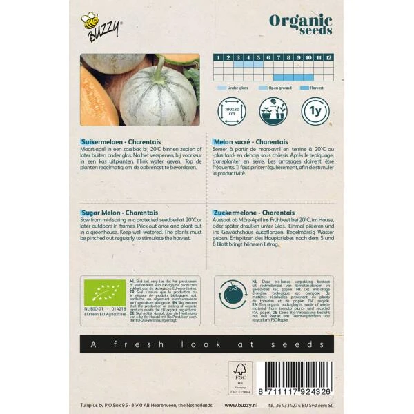 Kweek zelf meloen op een biologische manier en start met biologische zaden. Suikermeloen kan gezaaid worden van maart tot april in een zaaibak binnen bij een temperatuur van ongeveer 20°C of later buiten onder glas. Na het verspenen bij voorkeur uitplanten in de tuinkas. Geef flink wat water en top de planten regelmatig om de opbrengst te verhogen.