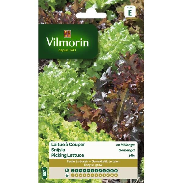 Dit mengsel van 3 variëteiten (rode eikenblad, groene eikenblad en gele gekrulde) laat u toe om kant en klaar gemengde sla te oogsten het hele jaar door.
