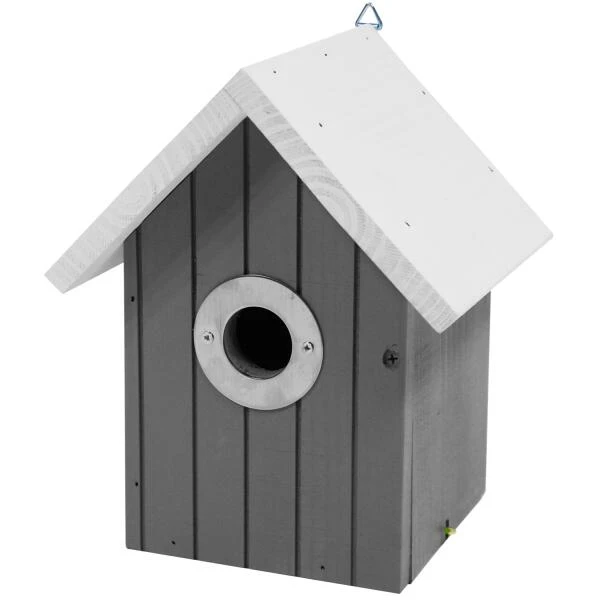 Mooie donkergrijze nestkast, afgewerkt met een wit dak.