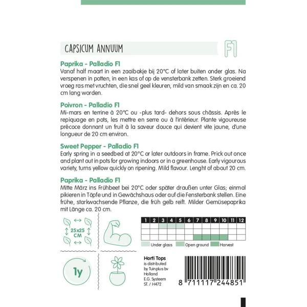 Paprika Palladio F1, zaaien vanaf half maartl in een zaaibakje bij zo’n 20° C of iets later buiten onder glas. Later kunnen deze planten in de kas of op de vensterbank. Snelgroeiend ras met snel kleurende vruchten. Mild van smaak en tot 20 cm lang.