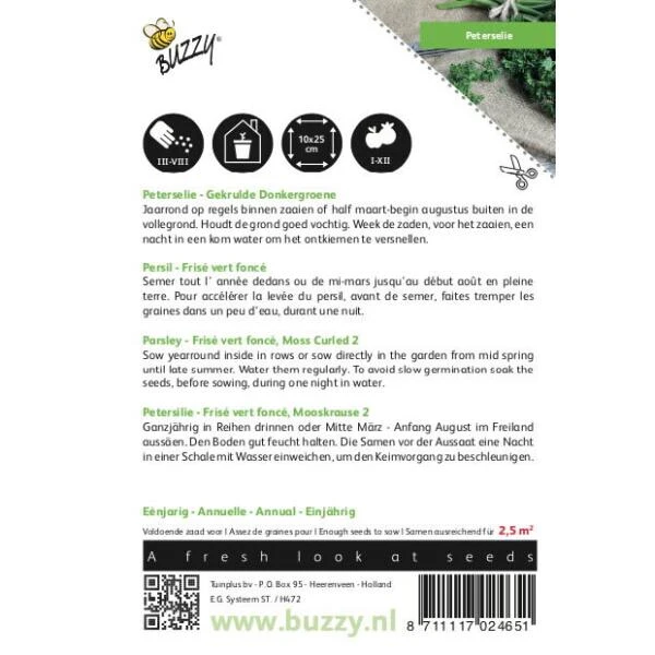 Peterselie Gekrulde Donkergroene vormt laagblijvende planten met fijn, donkergroen gekruld blad. Het kan zowel onder glas (winterteelt) als in de vollegrond geteeld worden. De smaak van het blad is sterk aromatisch en past bij allerlei gerechten.