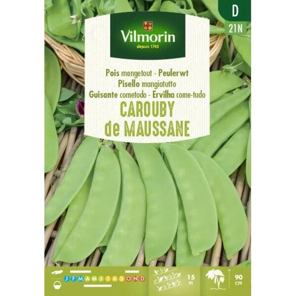 Peulerwt Carouby de Maussane zaaien levert een gegroepeerde en overvloedige productie van zeer grote, brede en platte peulen met een rijke, zoete smaak. De planten worden ongeveer 90 cm hoog.