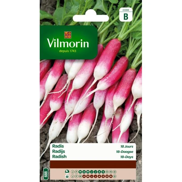 Radijs 18-daagse, deze traditionele variëteit vormt halflange radijsjes, roze met een wit voetje. Radijsjes bevatten vitamines (B en C) en mineralen (calcium, kalium, magnesium en ijzer).