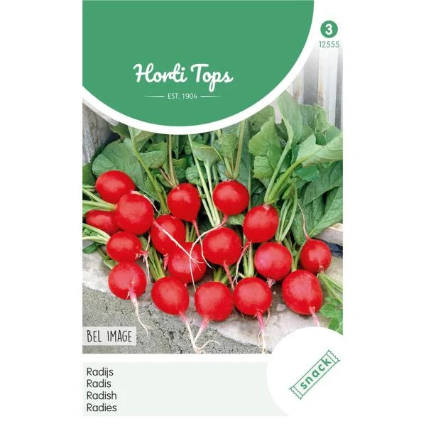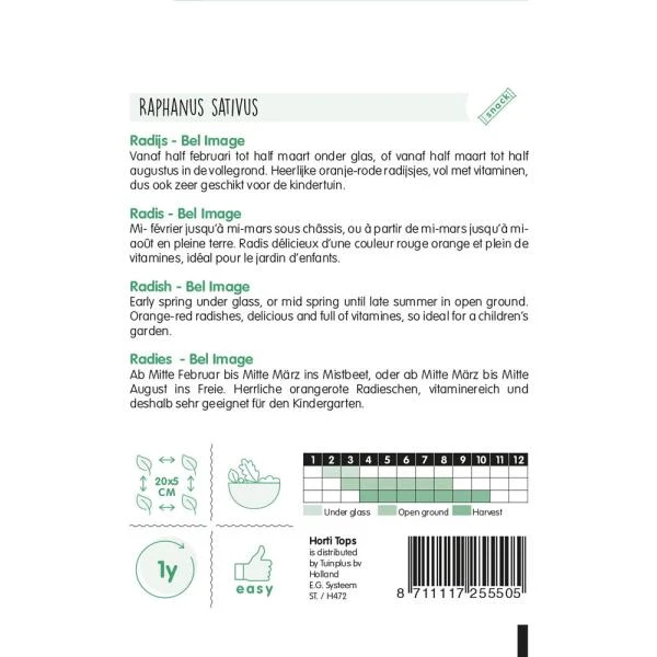 Radijs Bel Image, vanaf half februari tot half maart onder glas zaaien en daarna buiten tot half augustus. Heerlijk oranje rode radijsjes, vol met vitaminen…een prachtig ras voor in de kindertuin!