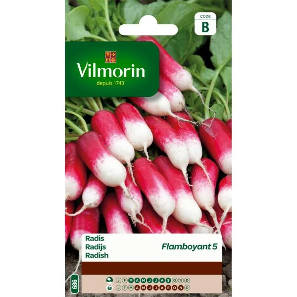 Radijs Flamboyant 5 is een snelgroeiende variëteit, wordt niet pikant en behoudt zeer lang goede culinaire kwaliteiten. Vormt mooie cylindrische halflange radijsjes.