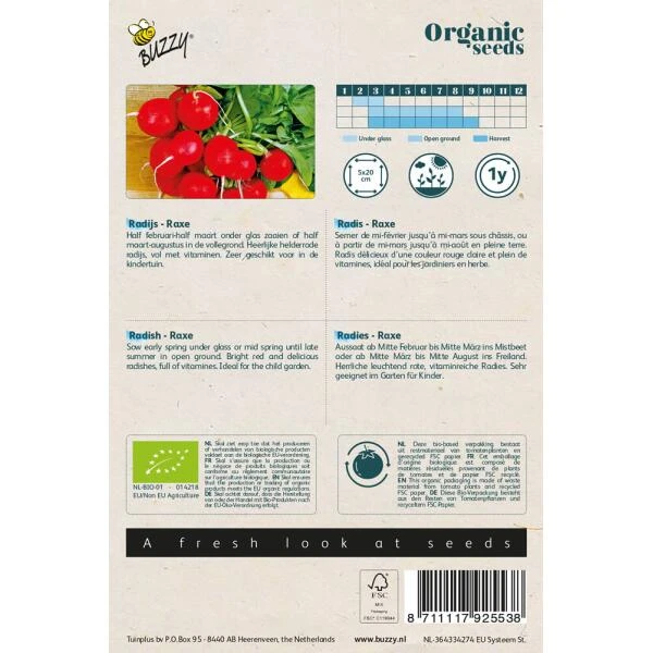 Kweek zelf radijzen op een biologische manier en start met biologische zaden. Radijs Raxe kan gezaaid worden vanaf half februari tot half maart onder glas of vanaf half maart tot half augustus in de volle grond. Het zijn heerlijke helderrode radijsjes vol vitaminen.