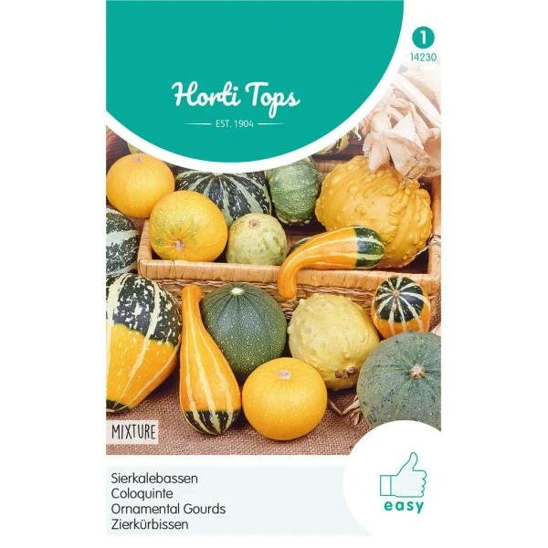 Sierkalebassen gemengd: zadenmengsel met zaden van verschillende kleine kalebassen in allerlei vormen en verschillende kleuren. Sommige vruchten zijn gedeeltelijk bewrat. De planten zijn rankend en kunnen eventueel op een klimrek worden geleid.