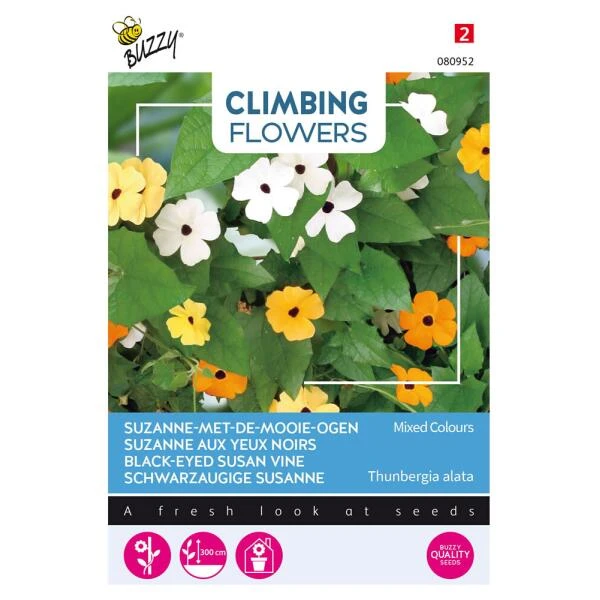 Gemengd Thunbergia is een fraaie eenjarige klimmer met unieke oranje, witte en gele bloemen. De plant kan wel tot 300 cm hoog worden.
