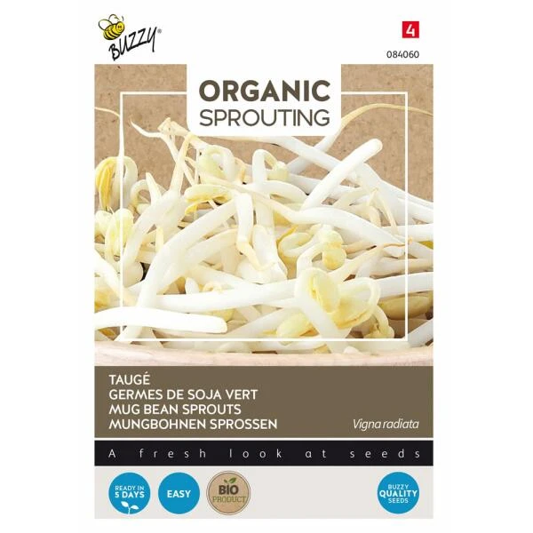 Taugé kan het hele jaar door gekweekt worden als spruitgroente in een sprouting pot. Je hebt er geen tuin voor nodig, geen groene vingers en je hebt snel resultaat! Strooi een lepel zaad in de kweekpot, voeg ruim lauw water toe en draai het deksel erop. Giet het overtollige water af. Zet de kweekpotten in het afdruiprek bij een temperatuur van ca. 20°C. Spoel 2 à 3 keer per dag en na ongeveer 6 dagen is de taugé klaar voor consumptie.