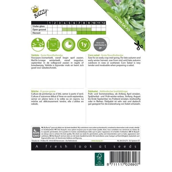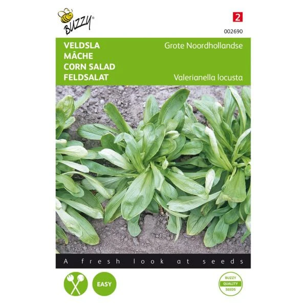 Zaden Veldsla grote noordhollandse zaaien: voorjaars- en zomerteelt vanaf begin april buiten, op een beschutte plaats, in regels met 12-15 cm tussenruimte. Voor de late herfstteelt wordt vanaf begin augustus tot half september nog buiten in de volle grond gezaaid, maar voor de winterteelt vanaf eind september tot eind oktober onder glas. In het laatste geval zaait men breedwerpig. Veldsla altijd dicht zaaien en niet uitdunnen. De plantafstand moet ongeveer 3 à 4 cm zijn. Na het zaaien het zaad licht inharken en de grond aandrukken. Het zaaibed dient goed vochtig gehouden te worden.