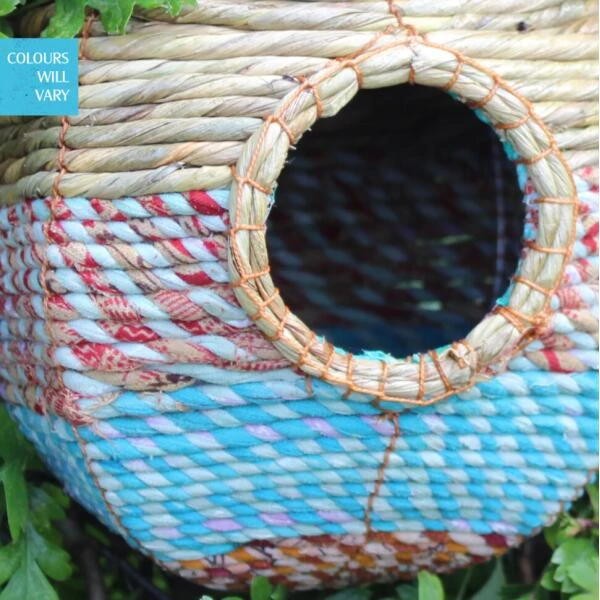 Elk nester is uniek in kleur! Het nest bestaat uit kleurrijke gerecyclede sari-patroon waardoor elk nester anders is. De invliegopening is geschikt voor kleine tuinvogels die alleen of met z’n tweeën op zoek zijn naar een nestplaats.