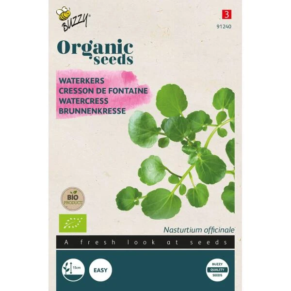 Kweek zelf waterkers op een biologische manier en start met biologische zaden. Waterkers kan vanaf april tot juli buiten gezaaid worden op een vochtig zaaibed. Verspeen één keer en plant het daarna uit op een schaduwrijke en vochtige plaats. Het jong blad van waterkers bevordert de stofwisseling.