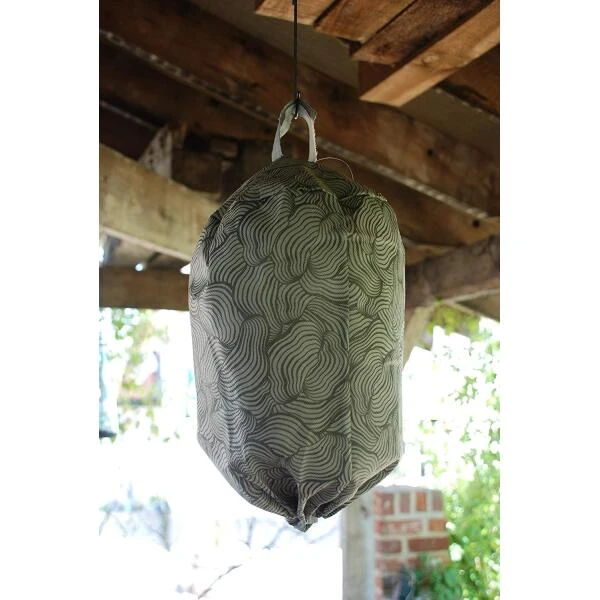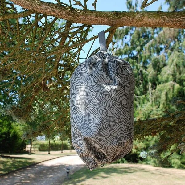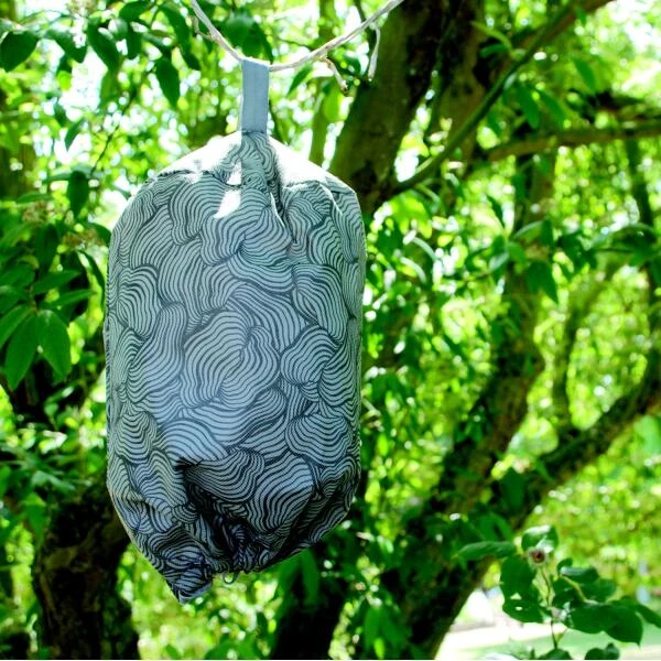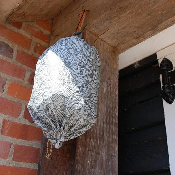 Dit nest is gemaakt van stof, heeft onderaan een rekker om af te sluiten en bovenaan een ophanglus met klitteband. Vul de nest met bijv. plastiekfolie tot een bolle vorm en sluit onderaan, klaar om op te hangen aan de onderkant van een parasol, in een boom of aan de dakrand waar de wespen je storen.