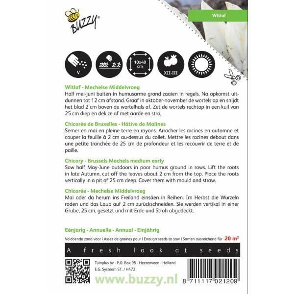 Zaden Witlof mechelse middelvroeg zaaien: omstreeks mei buiten op regels. In de herfst de wortels opgraven en het blad tot 2 cm boven de kruin afsnijden. De wortels rechtop in een 25 cm diepe kuil zetten en dan afdekken met aarde en stro, evt. onder glas.