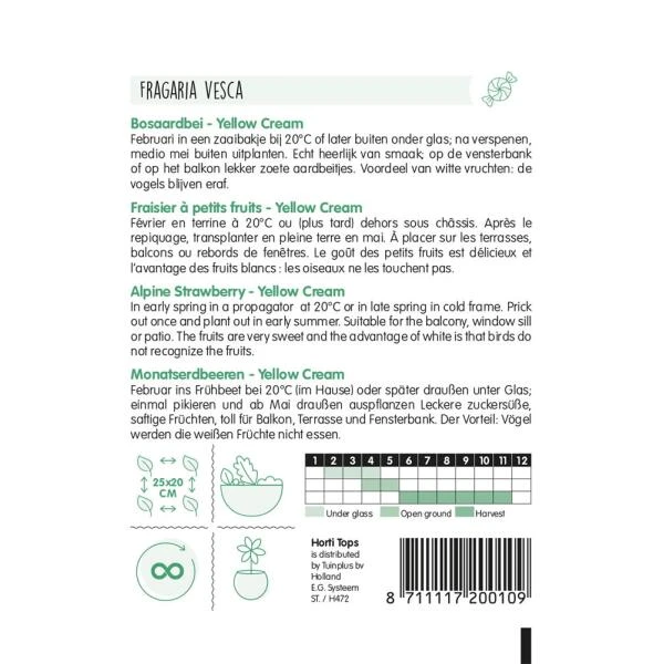 Fragaria vesca ‘Yellow Cream’ of de witte bosaardbei. Echt heerlijk van smaak! De lekkere zoete aardbeitjes zijn makkelijk te kweken op de vensterbank of op balkon. Een voordeel van de witte aardbeien is dat de vogels er van afblijven.