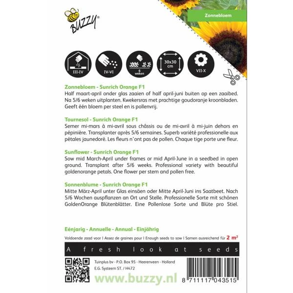 Kweek jouw eigen zonnebloemen met de zonnebloemzaden Sunrich Orange F1. Een echt kwekersras met prachtige goudoranje kroonblaadjes. Geeft één bloem per steel en is pollenrvij.
