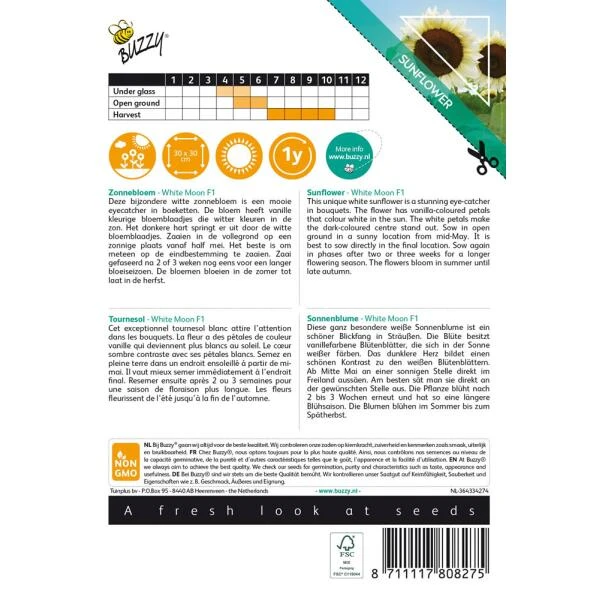 Zonnebloem White Moon F1 is een blikvanger in de tuin. De bloemen hebben vanillekleurige bloemblaadjes die witter kleuren in de volle zon. De bloemen zijn ook uitstekende snijbloemen. Het donkere hart staat in groot contrast.